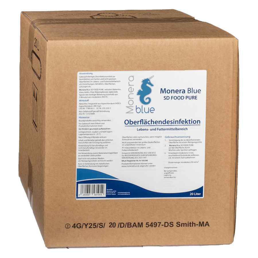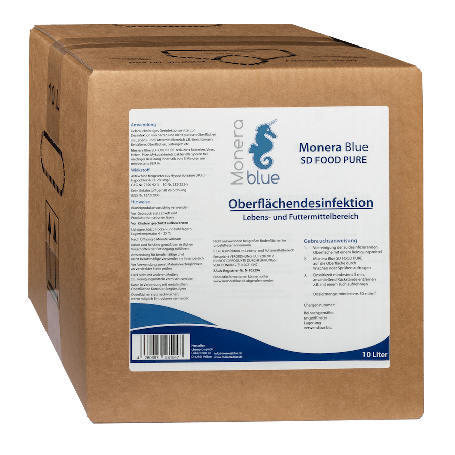 Monera Blue SD FOOD PURE reduziert Bakterien, Viren, Hefen, Pilze, Mykobakterieb, bakterielle Sporen bei niedriger Belastung innerhalb von 5 Minuten um mindestens 99,9 %